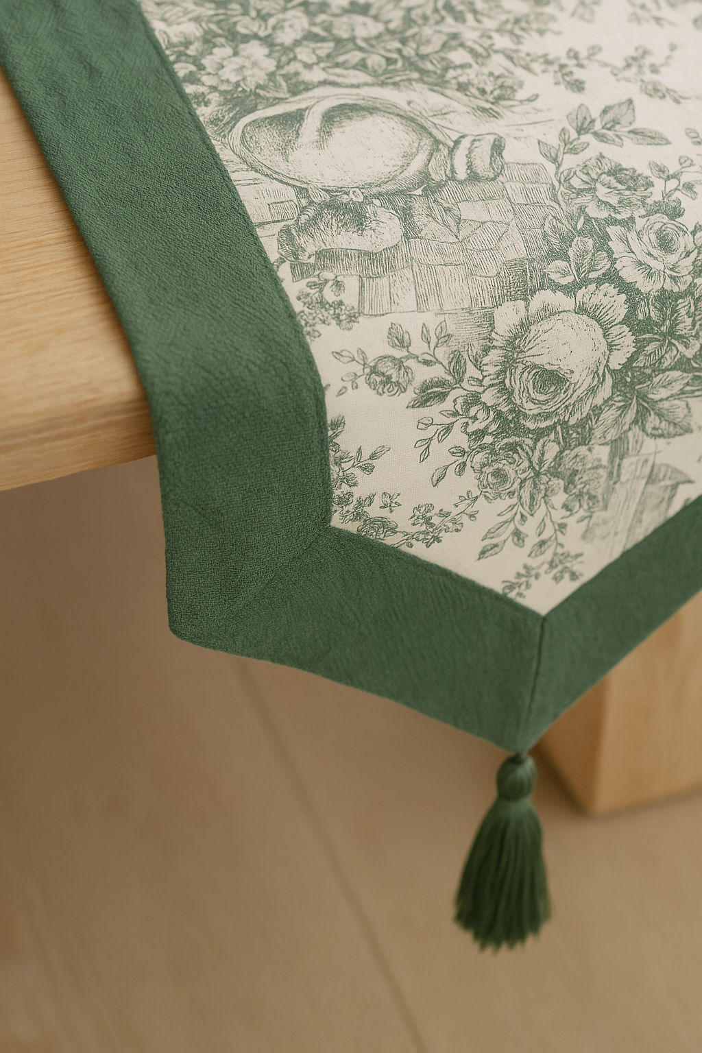 Elevate your table with this Heritage Green Toile Print Runner, crafted from pure 100% cotton for timeless elegance. The sophisticated toile pattern in heritage green brings refined charm to any dining space. Finished with delicate tassels adorning each pointer edge and framed by a clean, understated border, this runner combines classic design with subtle luxury. Perfect for adding a touch of refined style to your home.